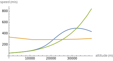 Visualize the solution for Felix's velocity together with the terminal velocity and the speed of sound. Note that Felix's speed rapidly increases until it meets or exceeds the speed of sound around 32,000 meters. It also briefly exceeds terminal velocity, increasing his instability as the atmosphere decelerates him: