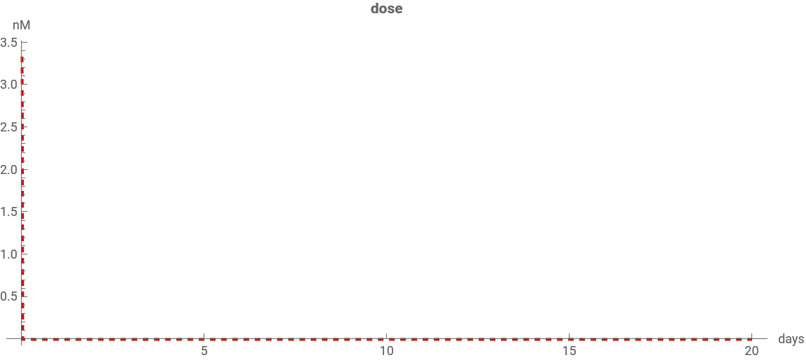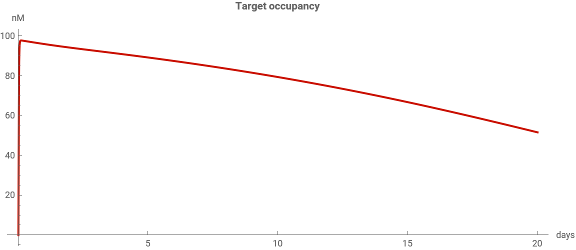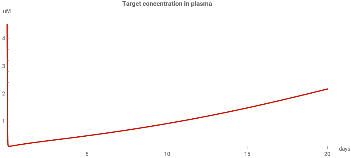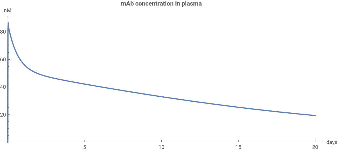 The mAb plasma concentration should reach its peak instantly and then decline. The concentration of free target molecules shows the reverse behavior: quickly declining due to mAb-target binding, and then slowly returning to baseline as the mAb concentration decreases.