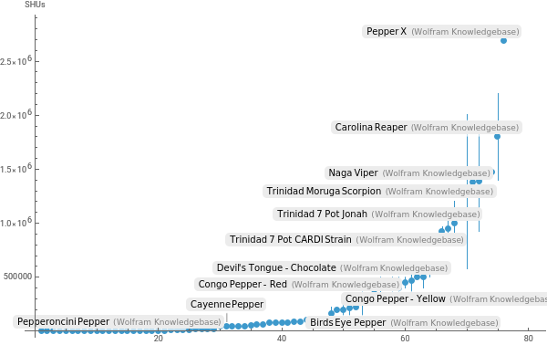 Aji PepperInterval[{30000.,50000.}],Anaheim PepperInterval[{500.,2500.}],Birds Eye PepperInterval[{100000.,225000.}],Cayenne PepperInterval[{30000.,50000.}],Chipotle PepperInterval[{5000.,10000.}],Guajillo PepperInterval[{2500.,5000.}],Jalapeño PepperInterval[{2500.,8000.}],Poblano PepperInterval[{1000.,1500.}],Serrano PepperInterval[{10000.,23000.}],Tabasco PepperInterval[{30000.,50000.}]