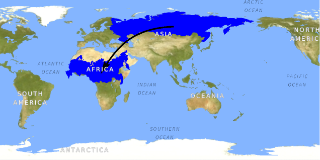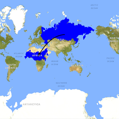 Map projections such as Mercator can significantly distort the apparent size of regions, especially at higher latitudes. In this example, we reposition Russia over Africa to remove location-based visual bias, and then compute their geodesic surface areas to determine (i) what percentage of Africa's area equals Russia's area and (ii) how many Russia-sized areas fit into Africa.