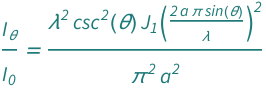 ![Copy to Clipboard QuantityVariable[Subscript[Style["I", Italic], "θ"]/Subscript[Style["I", Italic], "0"], "Unitless"] == (BesselJ[1, (2*Pi*QuantityVariable["a", "Distance"]*Sin[QuantityVariable["θ", "Angle"]])/QuantityVariable["λ", "Wavelength"]]^2*Csc[QuantityVariable["θ", "Angle"]]^2*QuantityVariable["λ", "Wavelength"]^2)/(Pi^2*QuantityVariable["a", "Distance"]^2)](https://www.wolframcloud.com/objects/resourcesystem/marketplacestorage/resources/9a0/9a035269-66d3-4c61-97aa-feb0ea703be4/Webpage/FormulaImage.png)