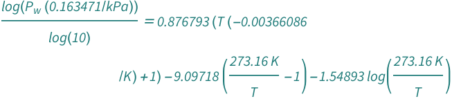 ![Copy to Clipboard Log[Quantity[0.16347081228646623, "Kilopascals"^(-1)]*QuantityVariable[Subscript["P", "w"], "Pressure"]]/Log[10] == -1.5489286414872234*Log[Quantity[273.16, "Kelvins"]/QuantityVariable["T", "Temperature"]] - 9.09718*(-1 + Quantity[273.16, "Kelvins"]/QuantityVariable["T", "Temperature"]) + 0.876793*(1 + Quantity[-0.0036608581051398447, "Kelvins"^(-1)]*QuantityVariable["T", "Temperature"])](https://www.wolframcloud.com/objects/resourcesystem/marketplacestorage/resources/f8a/f8a364f7-7c1a-4ef4-9fd8-73fcfa30ee17/Webpage/FormulaImage.png)