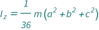 ![Copy to Clipboard QuantityVariable[Subscript["I", "z"], "MomentOfInertia"] == ((QuantityVariable["a", "Length"]^2 + QuantityVariable["b", "Length"]^2 + QuantityVariable["c", "Length"]^2)*QuantityVariable["m", "Mass"])/36](https://www.wolframcloud.com/objects/resourcesystem/marketplacestorage/resources/af3/af337540-62e8-48ba-a1a1-43d6216dcdfe/Webpage/FormulaImage.png)