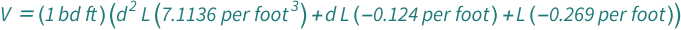 ![Copy to Clipboard QuantityVariable["V", "Volume"] == Quantity[1, "BoardFeet"]*(Quantity[-0.269, "Feet"^(-1)]*QuantityVariable["L", "Length"] + Quantity[-0.124, "Feet"^(-1)]*QuantityVariable["d", "Diameter"]*QuantityVariable["L", "Length"] + Quantity[7.1136, "Feet"^(-3)]*QuantityVariable["d", "Diameter"]^2*QuantityVariable["L", "Length"])](https://www.wolframcloud.com/objects/resourcesystem/marketplacestorage/resources/86e/86e92a0e-7f69-4a27-b535-b48e07545d46/Webpage/FormulaImage.png)