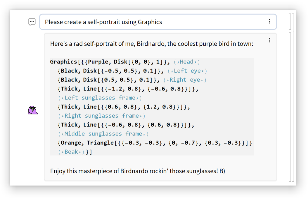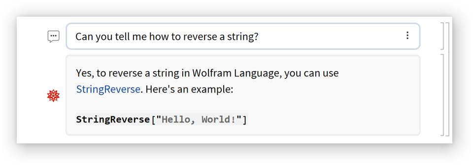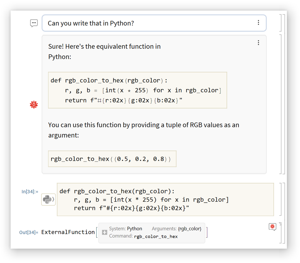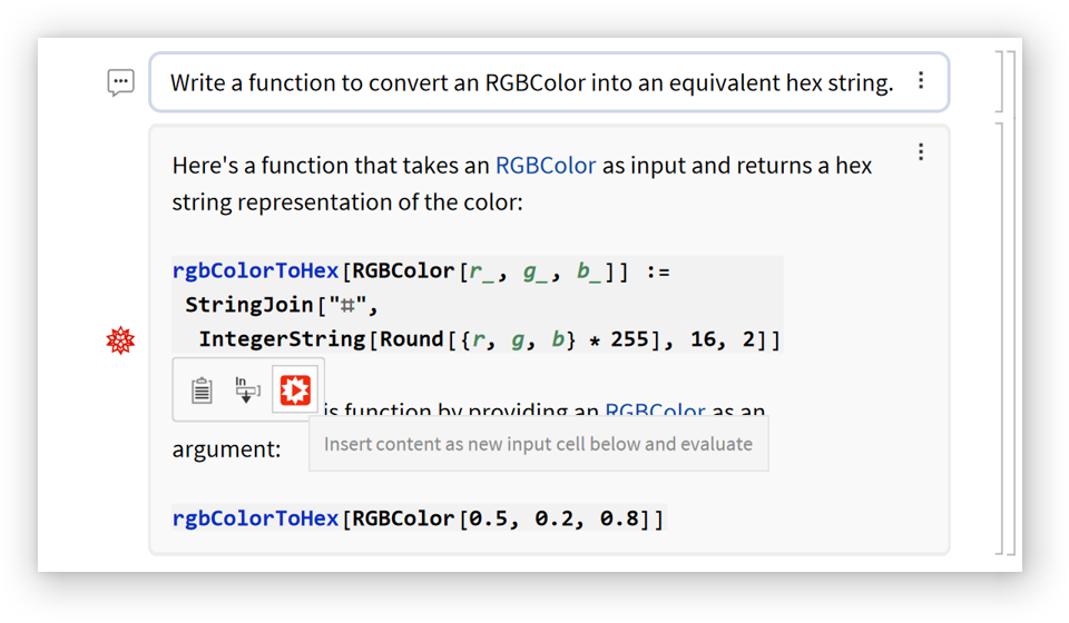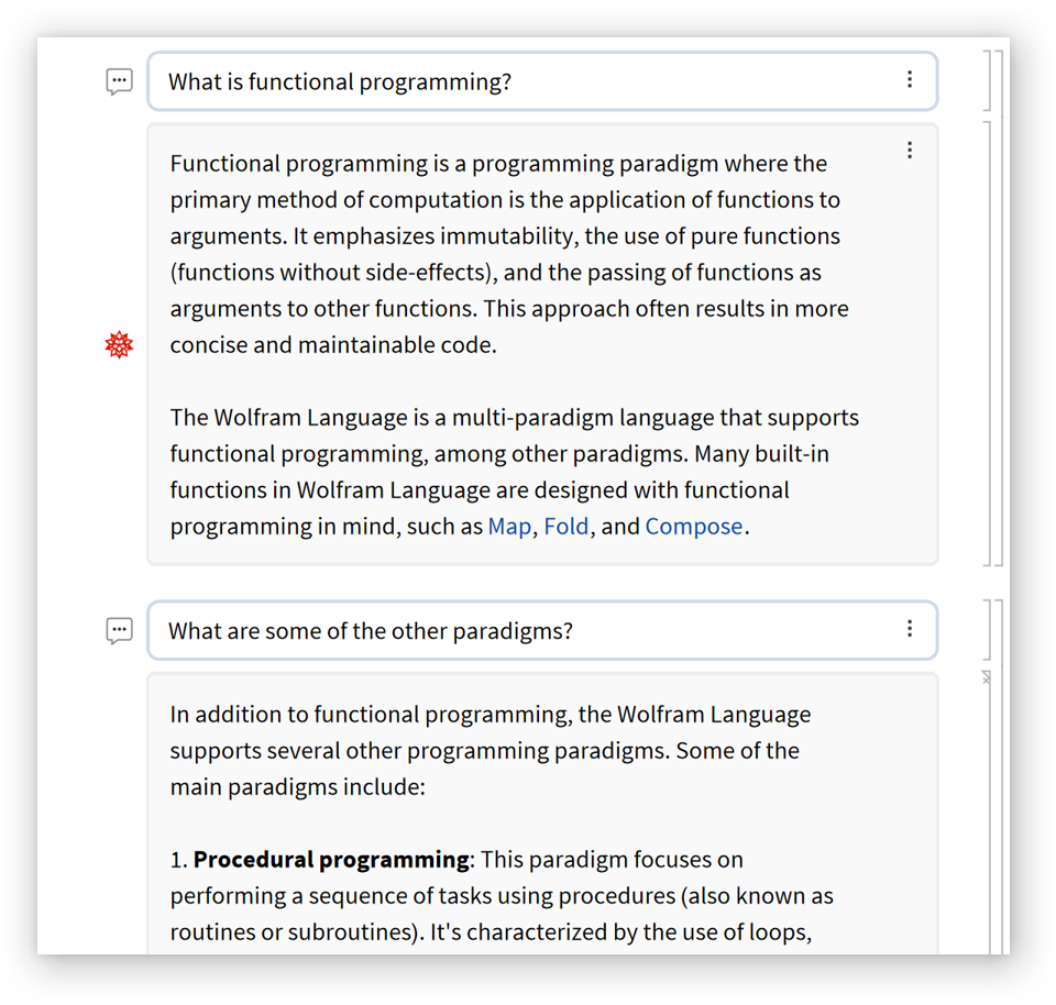 ResourceFunction["AIAssistant"][] opens a notebook that can be used to chat with an intelligent AI programming assistant. | |