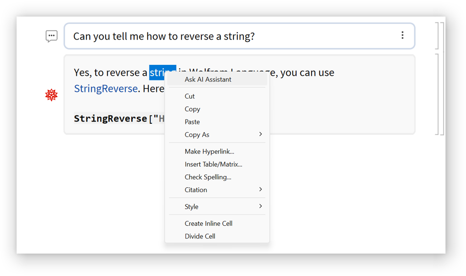Select some text and and choose "Ask AI Assistant" from the context menu: