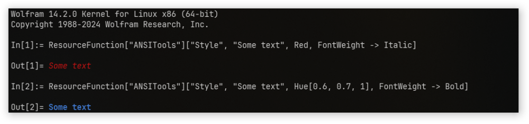 ResourceFunction["ANSITools"]["Style", text, styleOptions] generates ANSI escape codes styling text using the styleOptions provided. | |