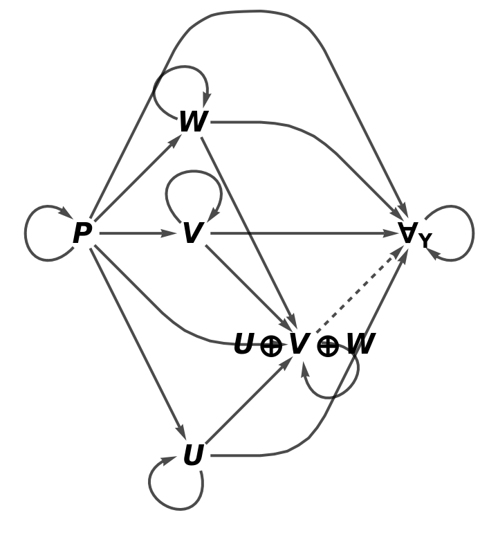 Show the full directed graph characterizing the universal property, without labels on the morphisms: