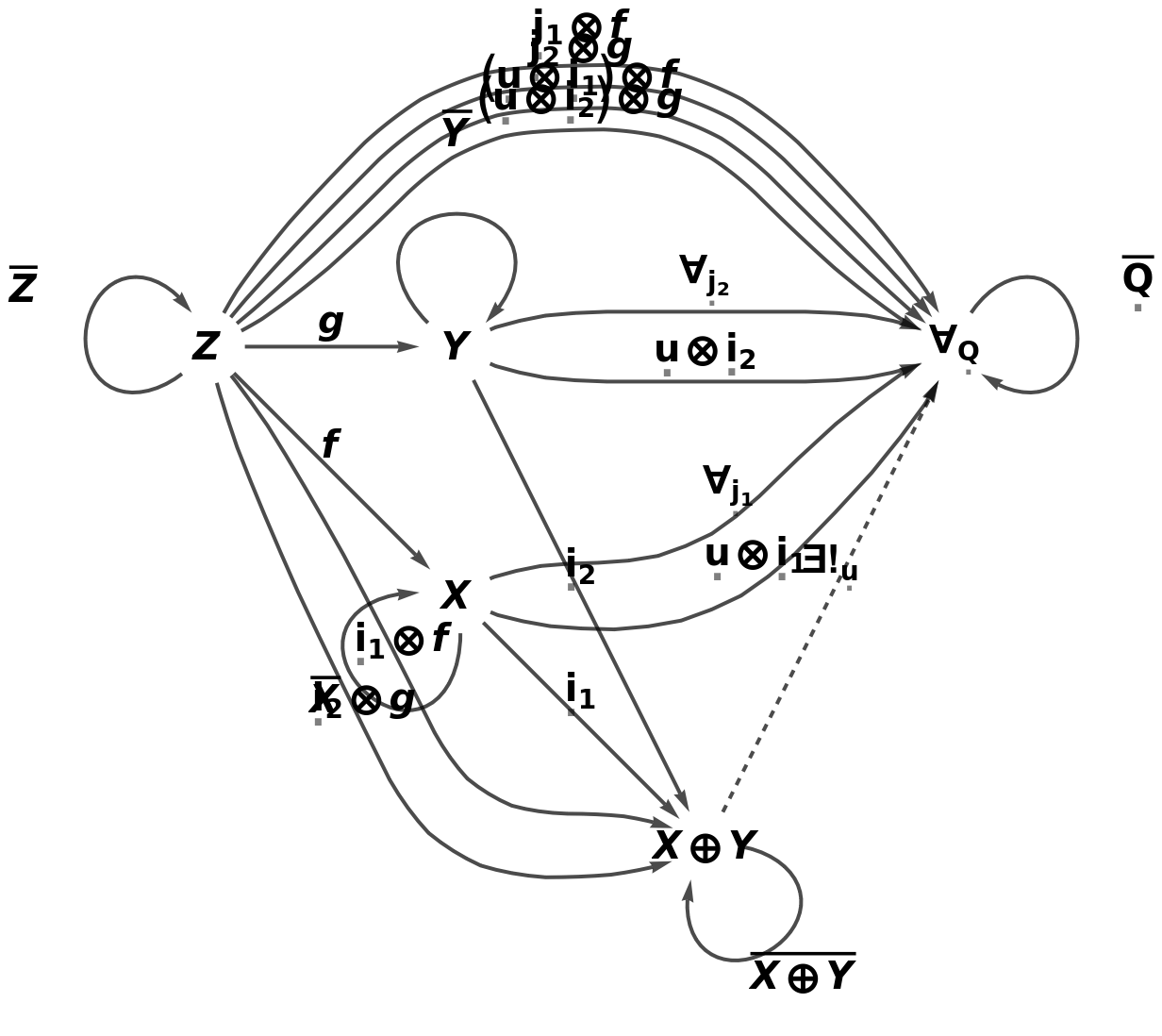 Show the reduced directed graph characterizing the universal property, with all equivalences between morphisms imposed and with labels on the morphisms: