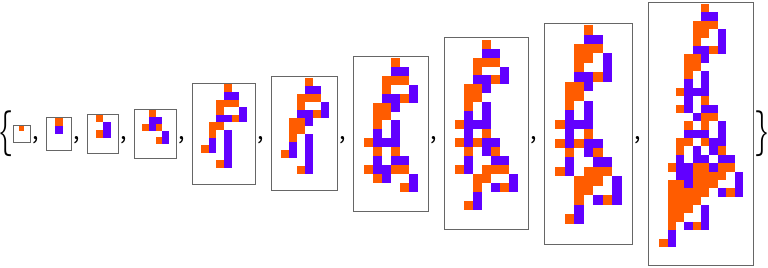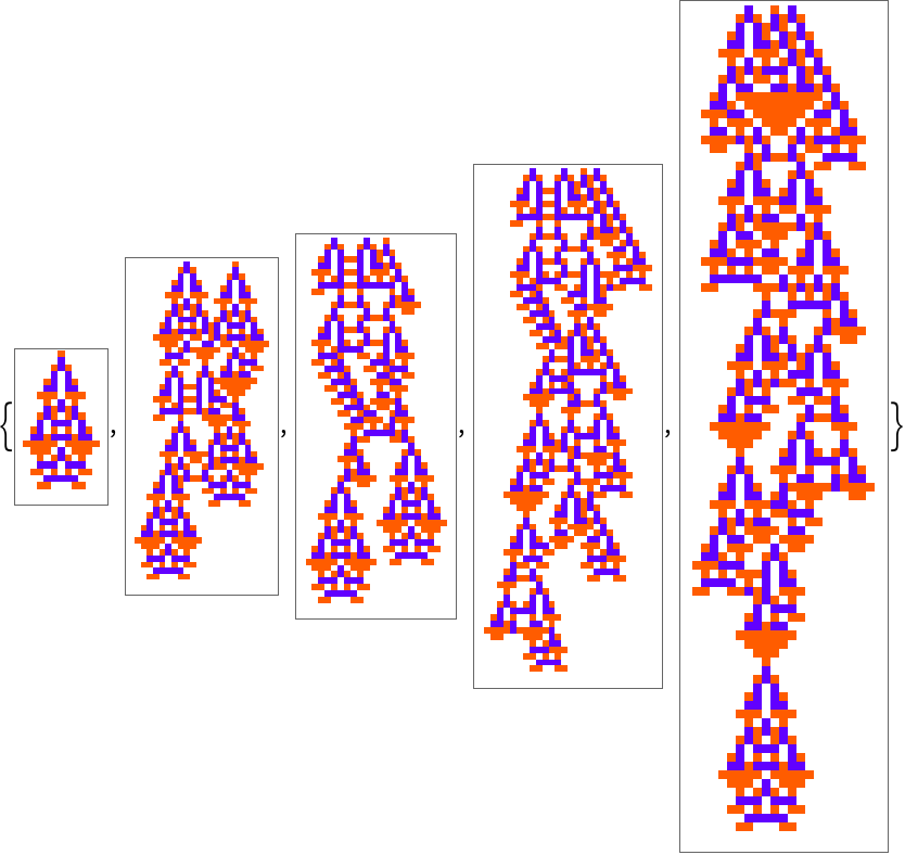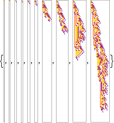 ResourceFunction["AdaptiveCellularAutomaton"][<|"Depth"→3, "Rule"→{0,k,r}|>] returns three steps in an adaptive search, starting from the k-color null rule and searching for rules that give longer finite length patterns. | |