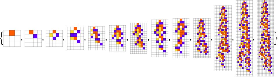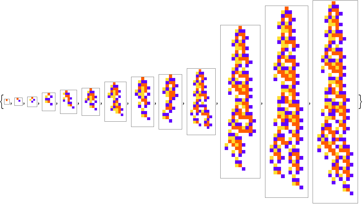 ResourceFunction["AdaptiveCellularAutomaton"][<|"Depth"→3|>] returns three steps in an adaptive search, starting from the 3-color null rule and searching for rules that give longer finite length patterns. | |