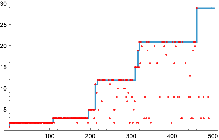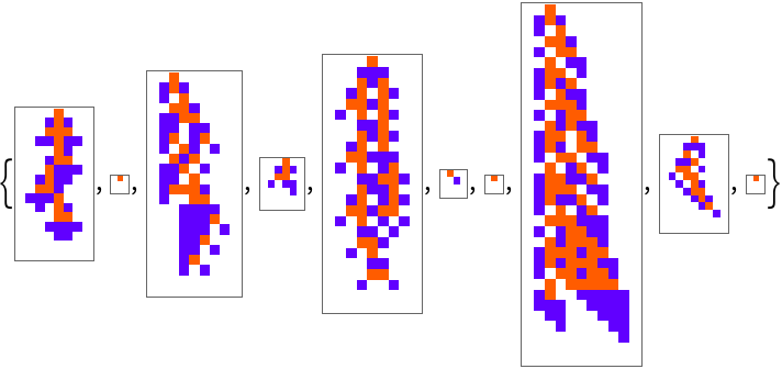 ResourceFunction["AdaptiveCellularAutomaton"][evospec,"Breakthroughs"] returns the breakthrough steps in the search. | |