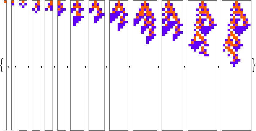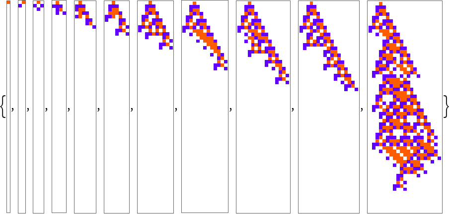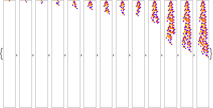 ResourceFunction["AdaptiveCellularAutomaton"][evospec,sequencespec,"Plot"] returns the plotted cellular automata for each step specified by the sequence specification. | |