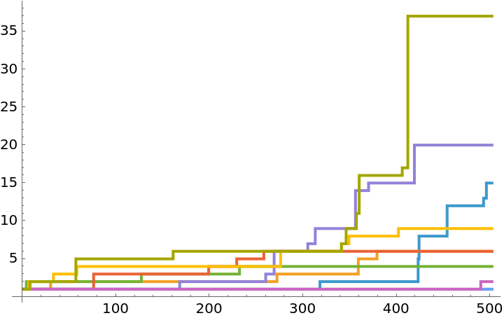 Evolve for 500 steps and plot the breakthrough mutation steps: