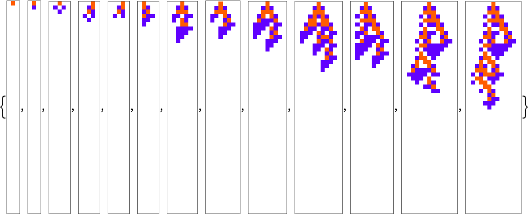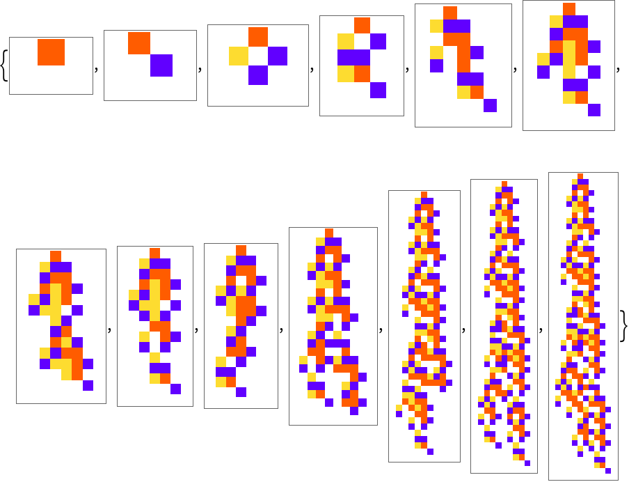 ResourceFunction["AdaptiveCellularAutomaton"][evospec,sequencespec,"Plot"] returns the plotted cellular automata for each step specified by the sequence specification. | |