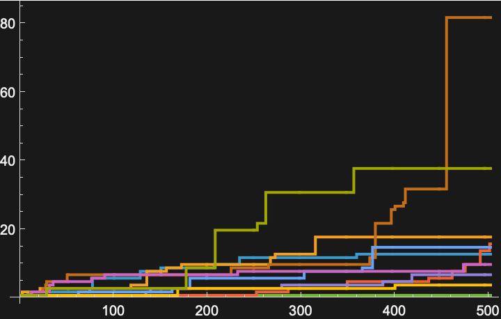 Evolve for 500 steps and plot the breakthrough mutation steps: