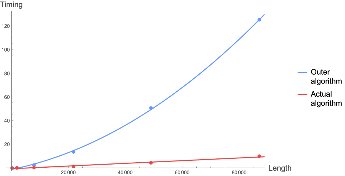 Timing would scale quadratically with respect to the size of the input arguments. Thus, the actual algorithm implemented by