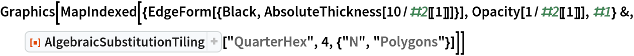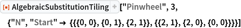 ResourceFunction["AlgebraicSubstitutionTiling"][tiling,steps] with the given tiling system specified by tiling, return the state after steps substitutions. |