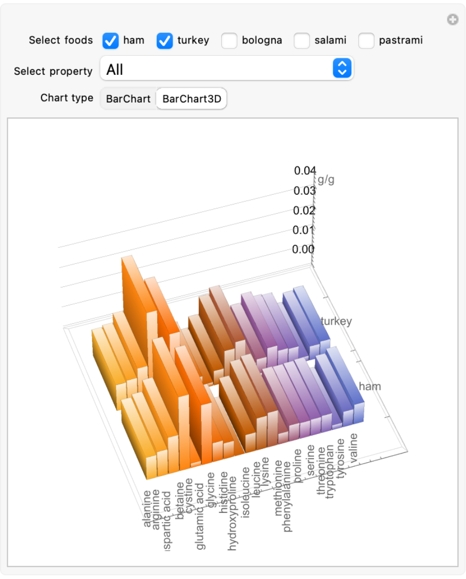 Select All in the dropdown list for an interactive 3D chart of the amino acids in these deli meats: