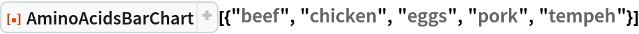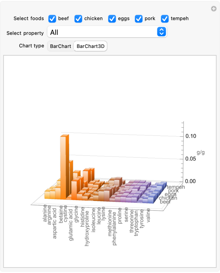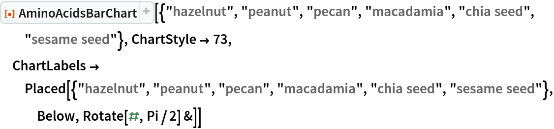ResourceFunction["AminoAcidsBarChart"][foods] returns customizable amino acid information for a list of foods as a 2D or 3D bar chart. |