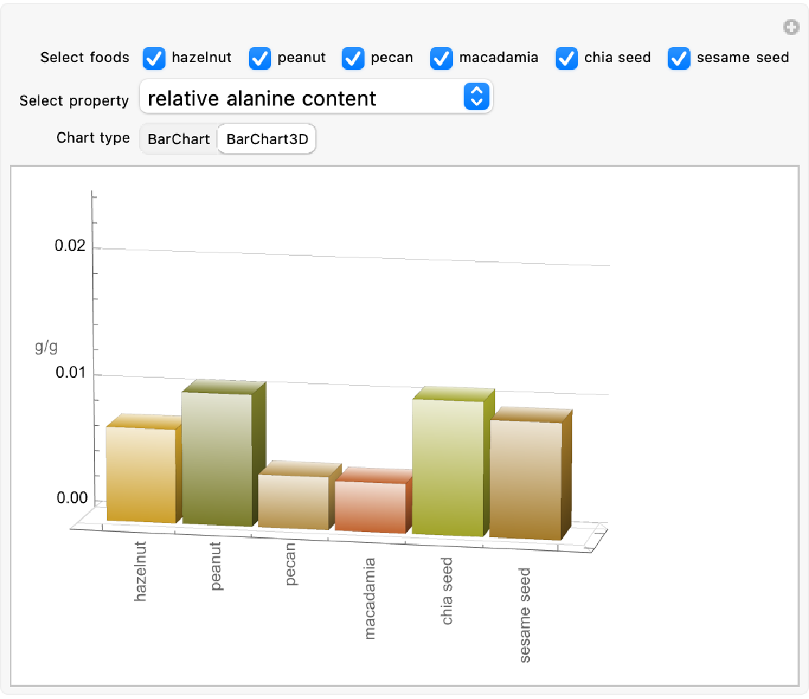 Select the BarChart3D chart type for a different perspective when comparing these nuts and seeds: