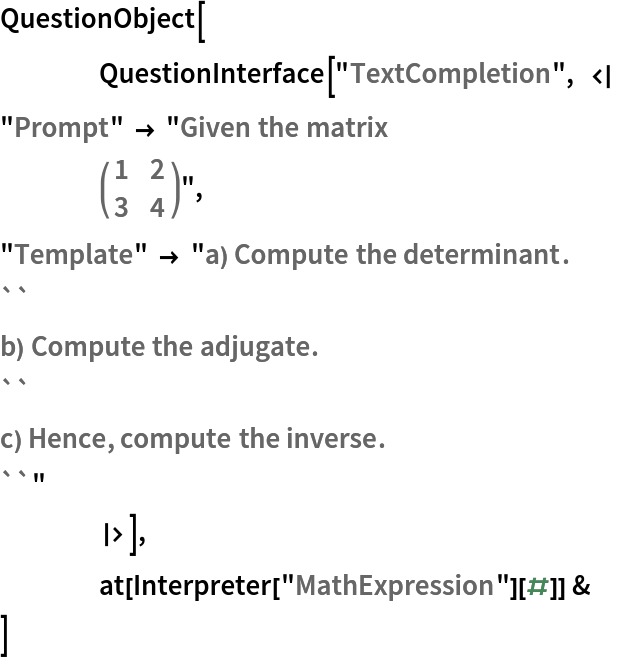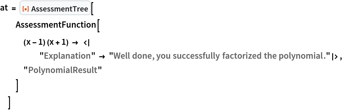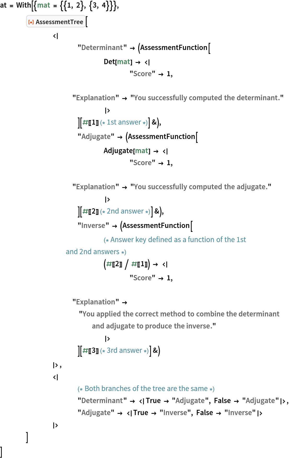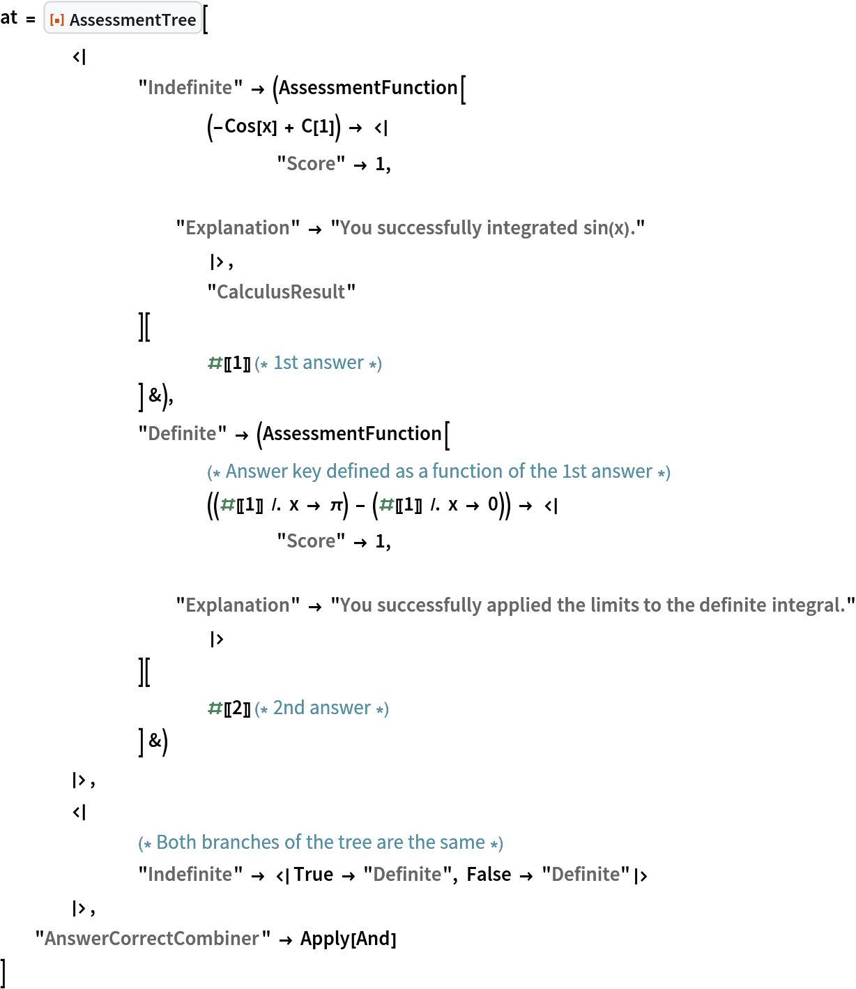 ResourceFunction["AssessmentTree"] enables follow-through marking in multi-part assessments. This means that if a student makes an error in an earlier part of a question, they can still earn marks for subsequent parts where they correctly use the incorrect answer from the earlier part, as long as their approach remains correct.