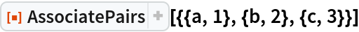 ResourceFunction["AssociatePairs"][{{key1,val1},{key2,val2},…}] gives the Association <|key1→val1,key2→val2, …|>. |