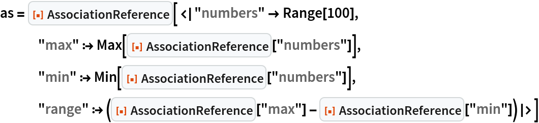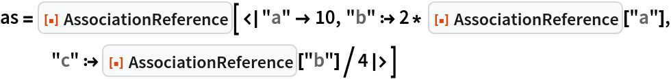 ResourceFunction["AssociationReference"][<|k1⧴val1,k2⧴val2,…|>] represents an Association where instances of ResourceFunction["AssociationReference"][ki] within the valj are resolved to the values vali. |