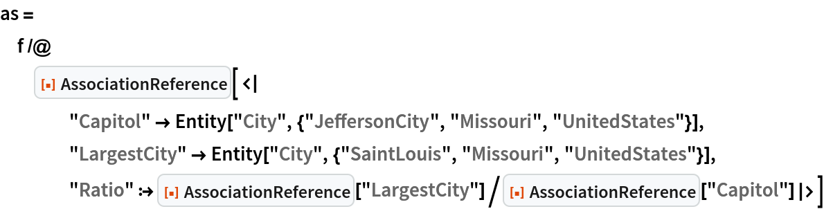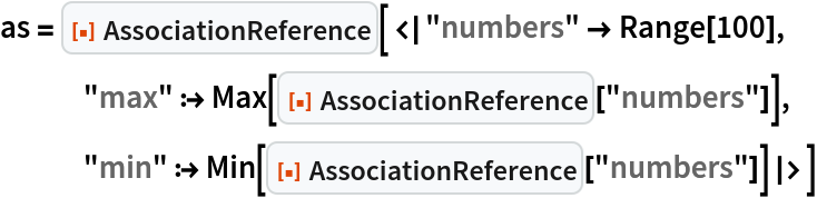 ResourceFunction["AssociationReference"][key] represents a reference to another value in an Association. | |