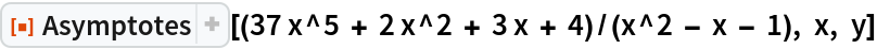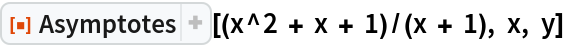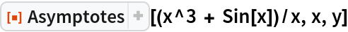 When called with three arguments, ResourceFunction["Asymptotes"] returns an association whose keys are among the following asymptote types: "Horizontal", "Vertical", "Oblique", "Parabolic" or "Other", and whose values are lists of asymptotes of the given type.