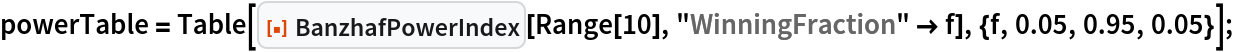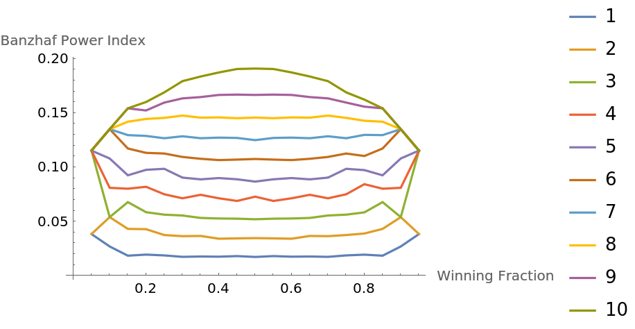 Take 30,000 voters in a business entity, each with a different number of votes with the distribution of votes determined by a Pareto distribution. Bin the voters and compute each bin's power index: