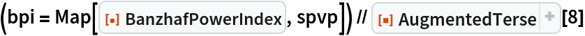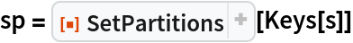 Take every set partition of the voters with the idea being that every grouping represents a coalition of voters. In the first example, everyone is in a single coalition. In the second example, a stands by itself and everyone else is in a coalition. In the third example, {a,b} is one coalition and {c,d,e} is the other. And so on for the 52 possible set partitions. (The number of partitions is equal to BellB[Length[s]]):