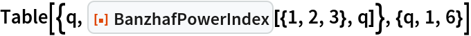 This example explores how coalition formation affects the Banzhaf power index. The idea is to let individuals form coalitions which pledge themselves to aggregate the votes of the members and vote as a block in a certain way. One then computes the Banzhaf power index of the coalitions. Each coalition then distributes its power equally over its members. Start by taking 5 people with different numbers of votes: