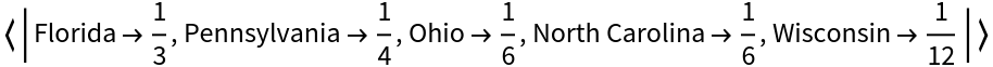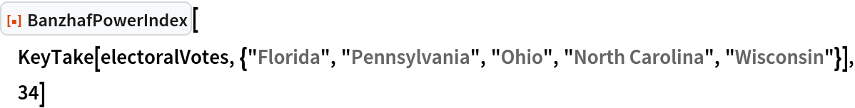 Assume that the allocation of electors in most states is considered known but the allocation of electors in Florida, Pennsylvania, Ohio, North Carolina, and Wisconsin are considered "in play." Of the 92 electoral votes those states have, a candidate needs 58 of them to win. Compute the Banzhaf power index of the remaining five states: