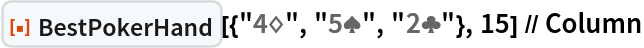 "BestPokerHand"][{"4\[DiamondSuit]", "5\[SpadeSuit]", "3\[HeartSuit]"}, {4, 9}] // Column