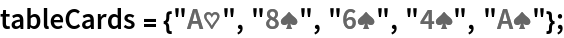tableCards = {"A\[HeartSuit]", "8\[SpadeSuit]", "6\[SpadeSuit]", "4\[SpadeSuit]", "A\[SpadeSuit]"};