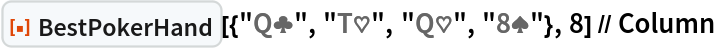 "BestPokerHand"][{"Q\[ClubSuit]", "T\[HeartSuit]", "Q\[HeartSuit]", "8\[SpadeSuit]"}, 8] // Column