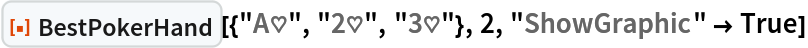 "BestPokerHand"][{"A\[HeartSuit]", "2\[HeartSuit]", "3\[HeartSuit]"}, 2, "ShowGraphic" -> True]