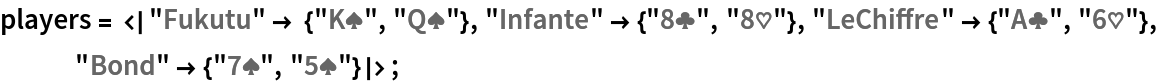 players = <|"Fukutu" -> {"K\[SpadeSuit]", "Q\[SpadeSuit]"}, "Infante" -> {"8\[ClubSuit]", "8\[HeartSuit]"}, "LeChiffre" -> {"A\[ClubSuit]", "6\[HeartSuit]"}, "Bond" -> {"7\[SpadeSuit]", "5\[SpadeSuit]"}|>;
