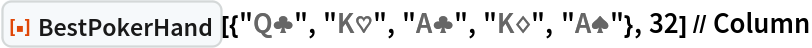 "BestPokerHand"][{"Q\[ClubSuit]", "K\[HeartSuit]", "A\[ClubSuit]", "K\[DiamondSuit]", "A\[SpadeSuit]"}, 32] // Column