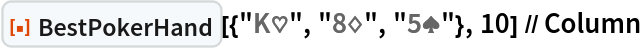 "BestPokerHand"][{"K\[HeartSuit]", "8\[DiamondSuit]", "5\[SpadeSuit]"}, 10] // Column