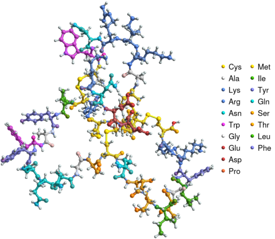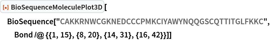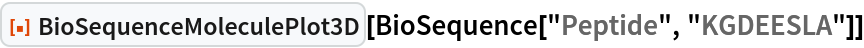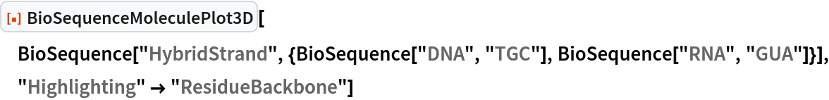 ResourceFunction["BioSequenceMoleculePlot3D"][bioseq] creates a three-dimensional model of the biomolecular sequence bioseq, where all residues are highlighted. |
