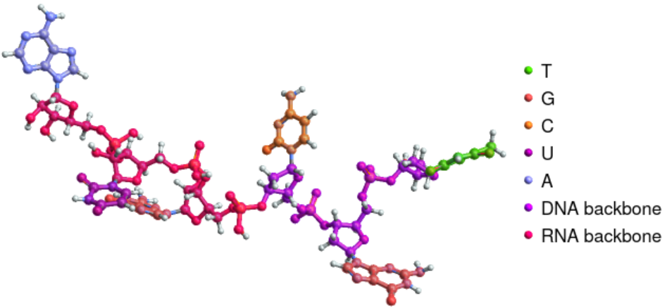 Highlight the sugars and phosphate groups together in a DNA-RNA hybrid strand: