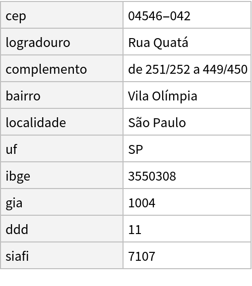 "cep" Brazilian zip code number (CEP - Código de Endereçamento Postal) "logradouro" street or avenue name "complemento" additional optional data "bairro" neighborhood or city name "localidade" county "uf" state name code (acronym) "ibge" official geographical brazilian id (IBGE - Instituto Brasileiro de Geografia e Estatística