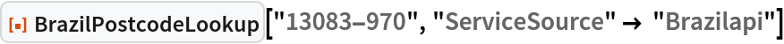 ResourceFunction["BrazilPostcodeLookup"][code] returns a Dataset of address data for a given Brazilian postal code code. |