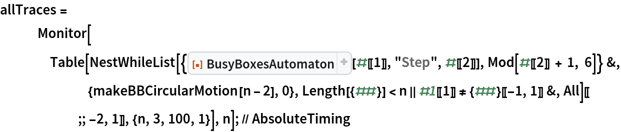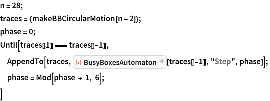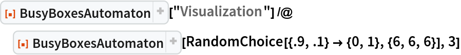 ResourceFunction["BusyBoxesAutomaton"][init,n] runs for n steps. | |