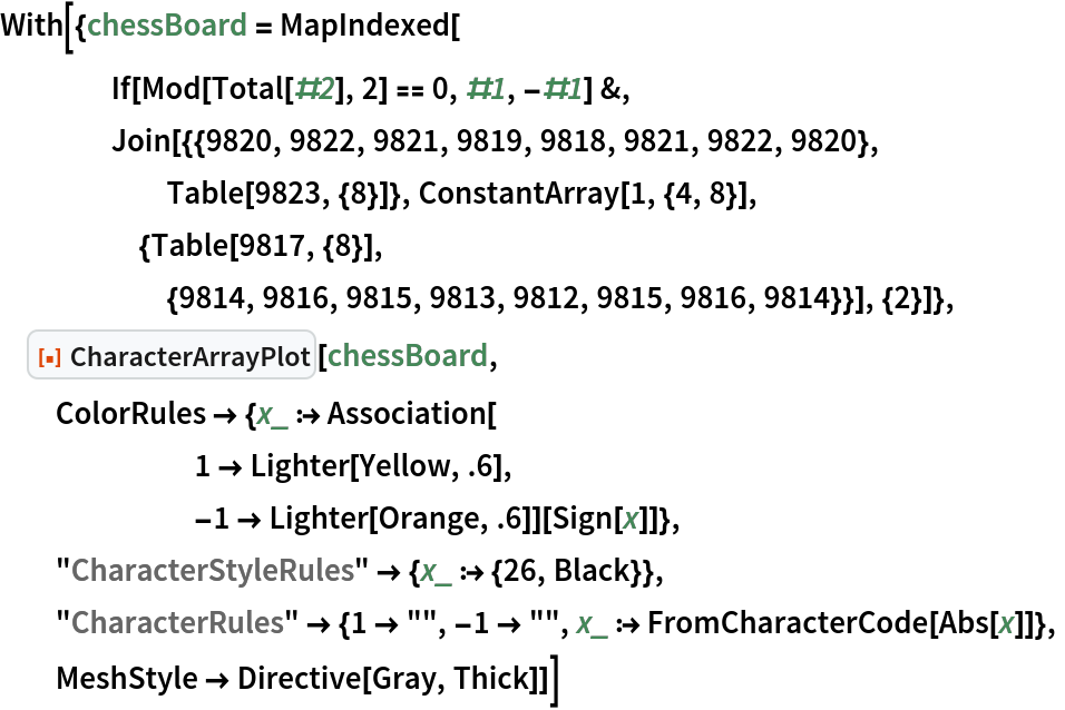 ResourceFunction["CharacterArrayPlot"][chessBoard,