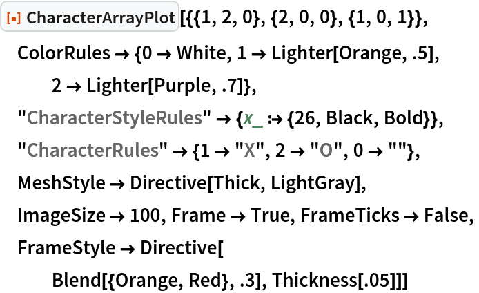 "CharacterRules" -> {1 -> "X", 2 -> "O", 0 -> ""},