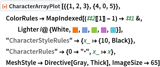 ResourceFunction["CharacterArrayPlot"][{{1, 2, 3}, {4, 0, 5}},