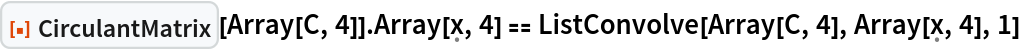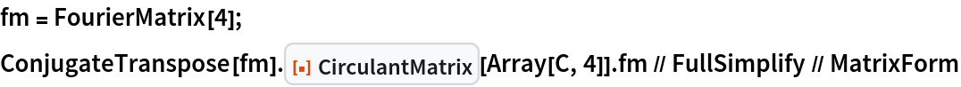 ResourceFunction["CirculantMatrix"][{c1,c2,…,cn}] gives the circulant matrix whose first column consists of entries c1,c2, …. |